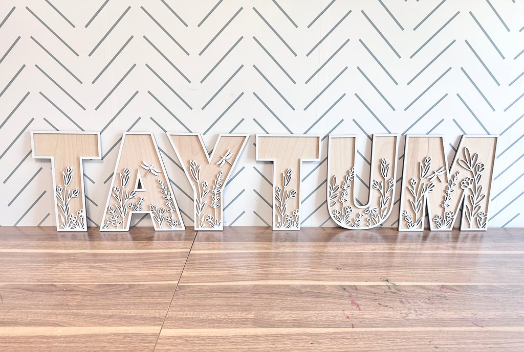 Decorate a bedroom or playroom with these adorable wildflower letters. These flower themed 3D layered letters make a super cute nursery decor, baby shower gift, even the perfect floral wedding or bridal shower decor piece!